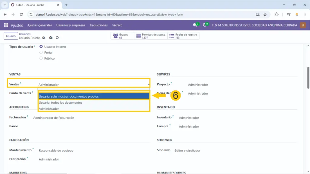 5) Si se trabaja con multiempresa colocamos a que empresas va a tener acceso ese usuario así como cual es la empresa principal, también dejamos marcado en usuario interno.