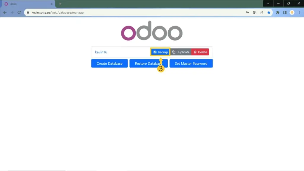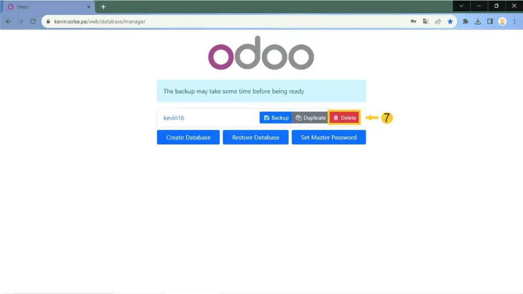 7) Si se desea colocar un backup debemos dirigirnos igual /database/manager. y damos clic en "Delere".