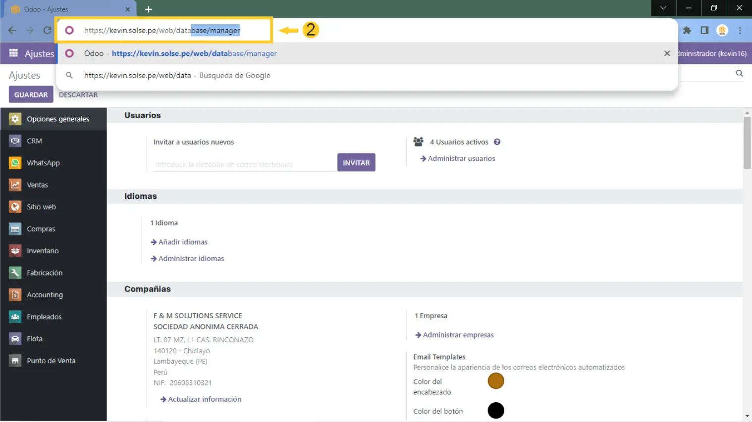 2) En la URL luego de "Web" debemos colocar "/database/manager".