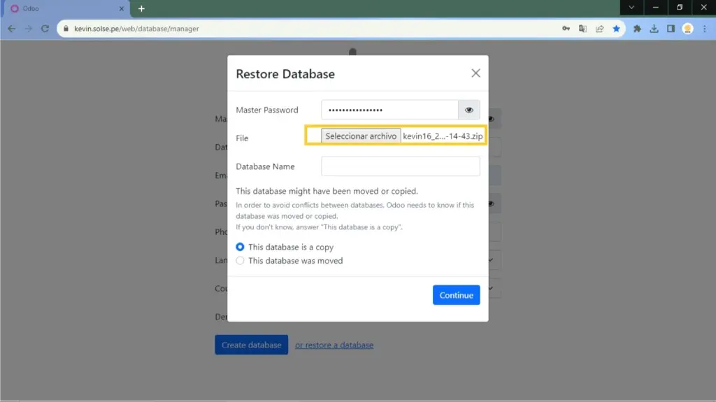 11) En el campo "File" damos clic en "Seleccionar archivo" para subir el backup.