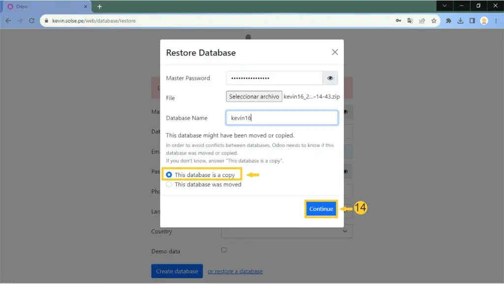 14) Luego nos aseguramos que este marcado "This database is a copy" y luego clic en "Continue".