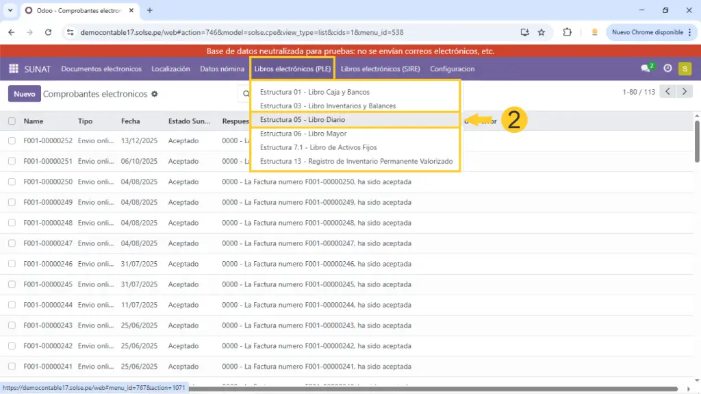 2) Luego damos clic en "Libros electrónicos (PLE), luego clic en "Estructura 05 - Libro Diario."