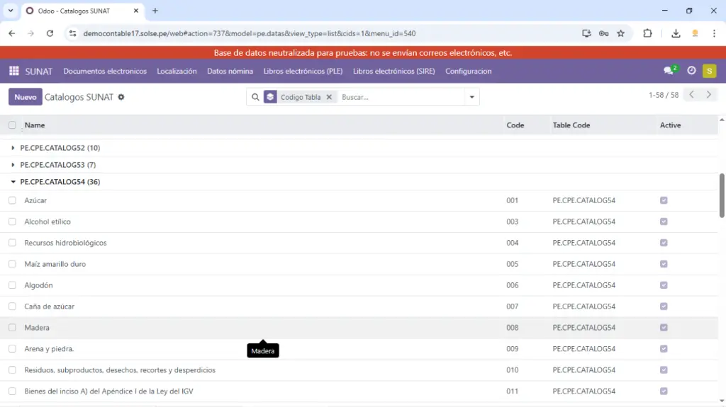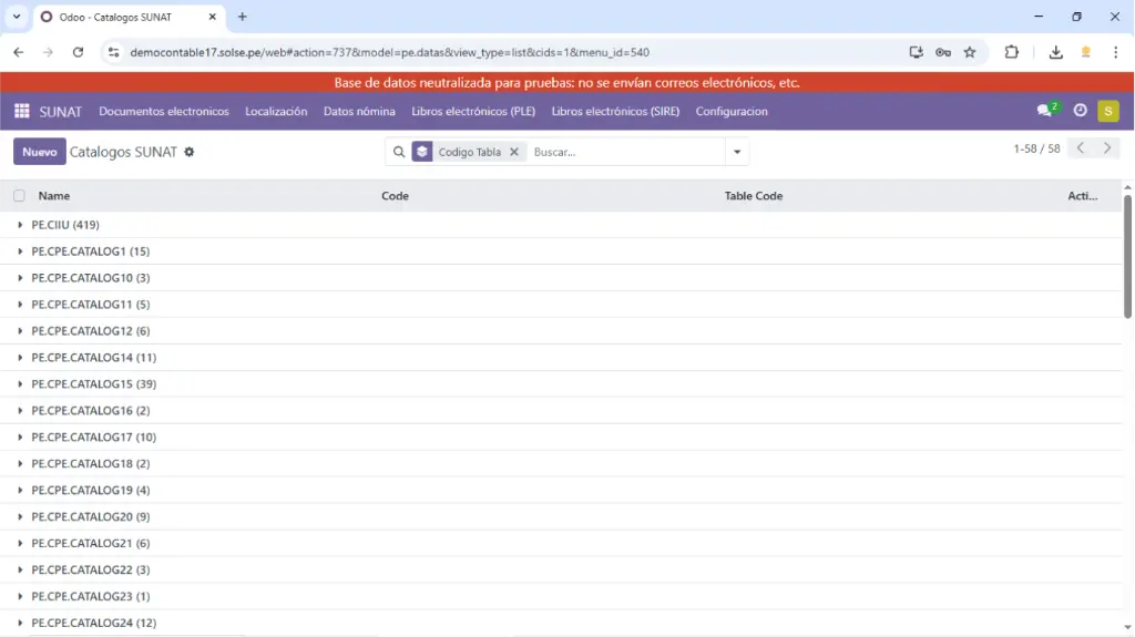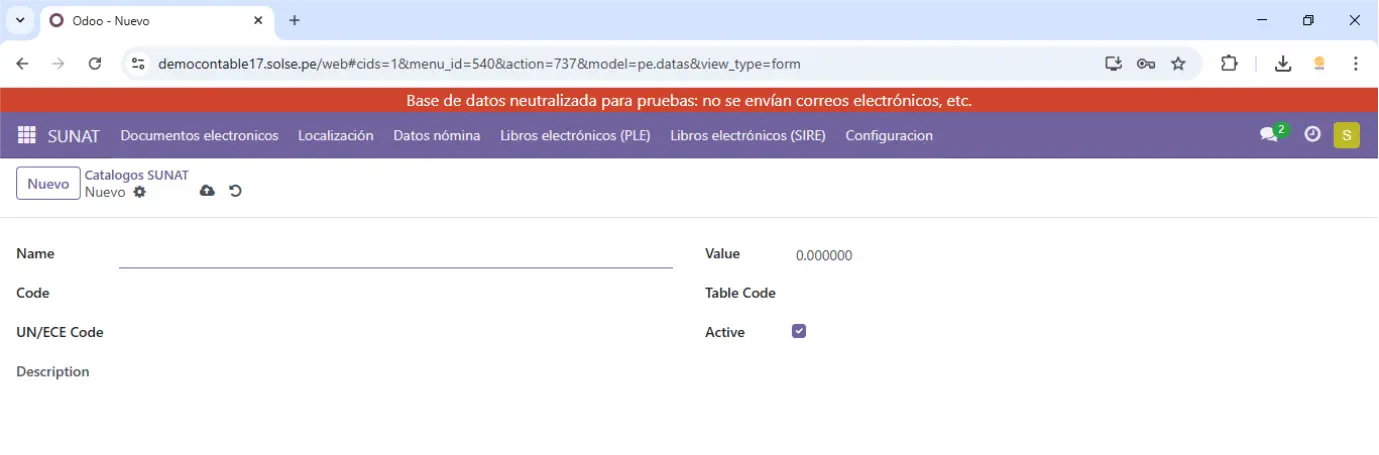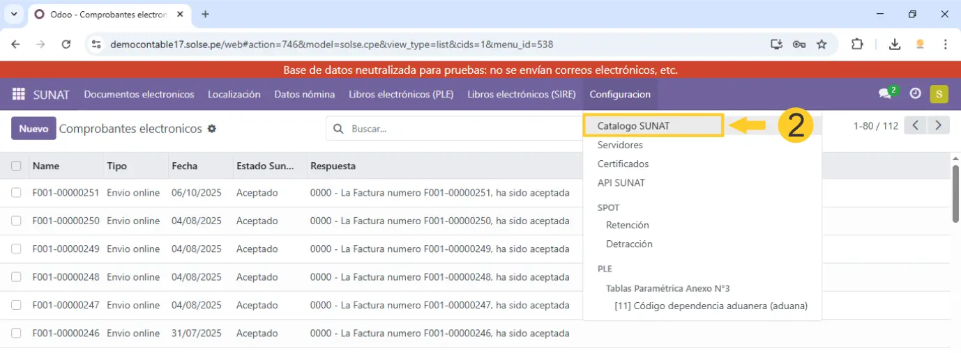 2) Luego damos clic en "Configuración" y clic en "Catalogo SUNAT".