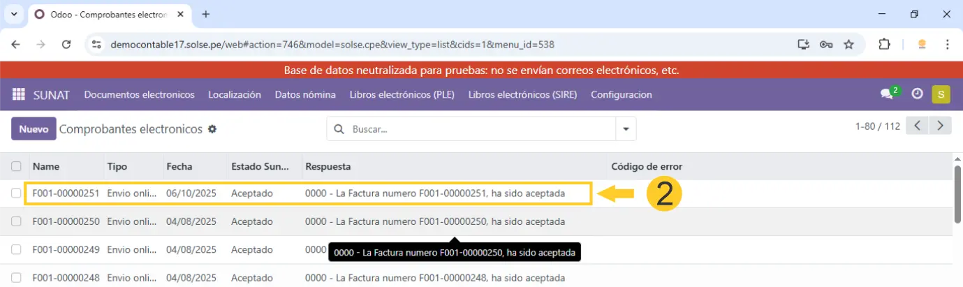 5) Si nos dirigimos a "Facturas" podemos observar la factura que se ha enviado a SUNAT.