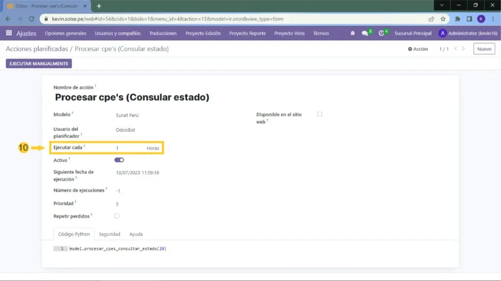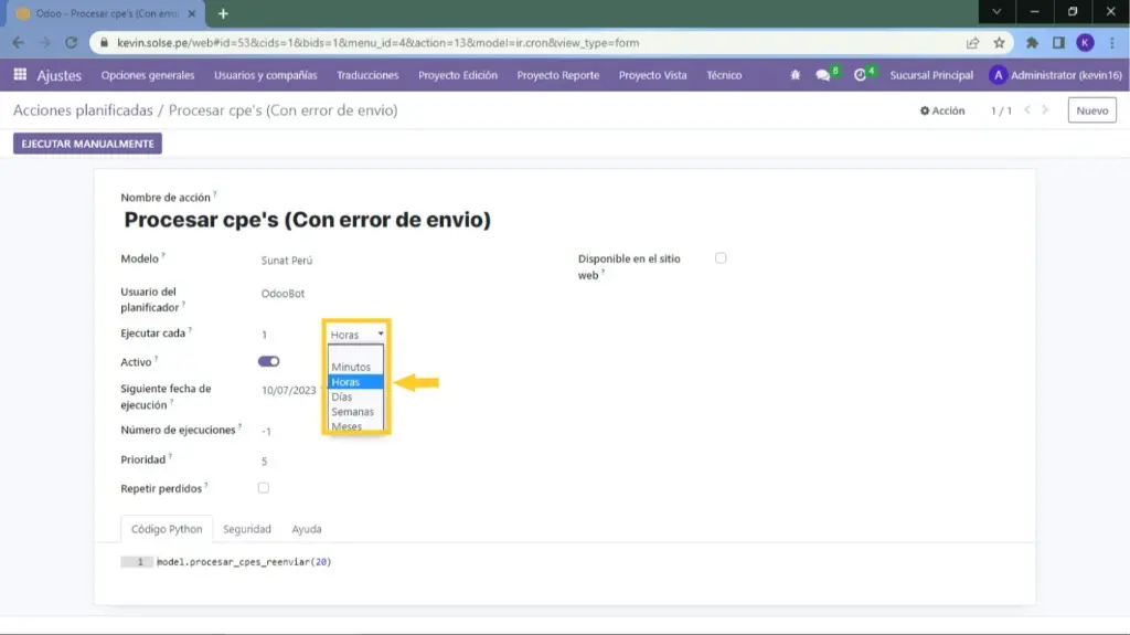 10) En el campo "Ejecutar cada" podemos elegir el tiempo en que deseamos que se ejecute ya sean minutos, horas, días, semanas o meses.