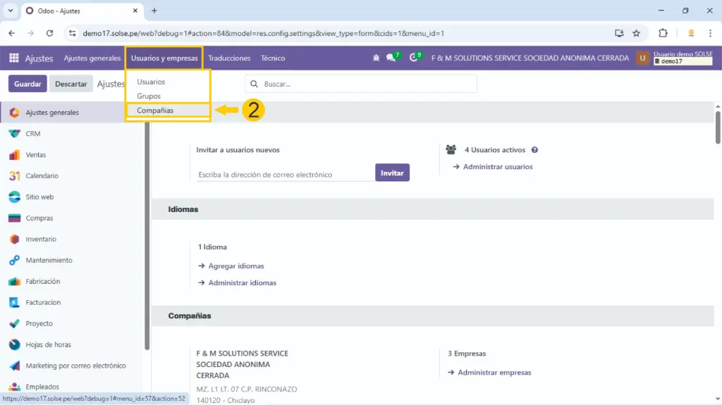 5) Luego hacemos clic en "Usuarios y compañías", después clic en "Compañías".