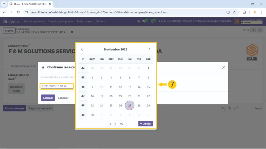 11) Colocamos la fecha que deseamos que recalcule nuestro stock.