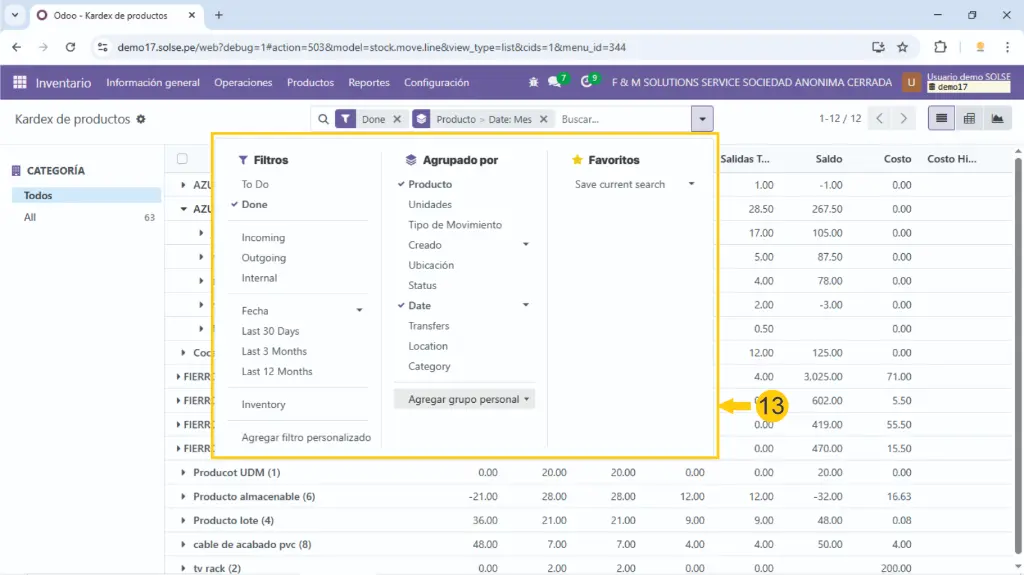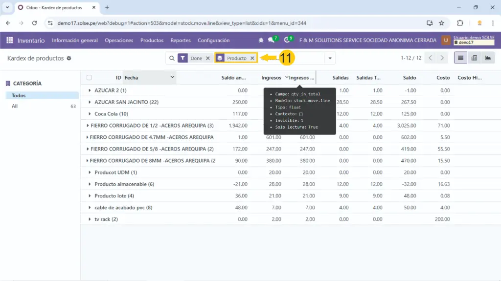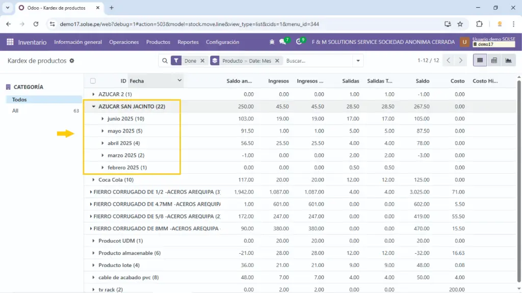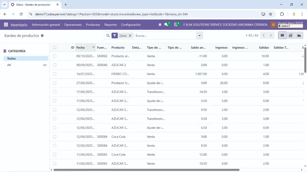 Hacemos clic en el producto y nos aparecerán los movimientos.