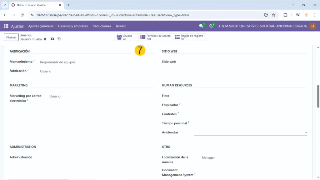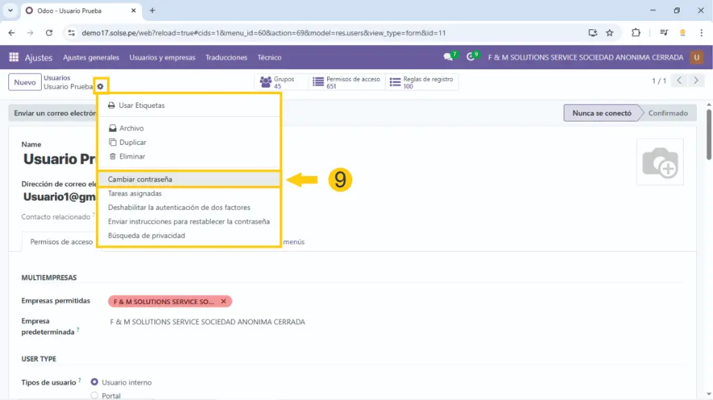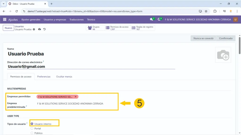 5) Si se trabaja con multiempresa colocamos a que empresas va a tener acceso ese usuario así como cual es la empresa principal, también dejamos marcado en usuario interno.