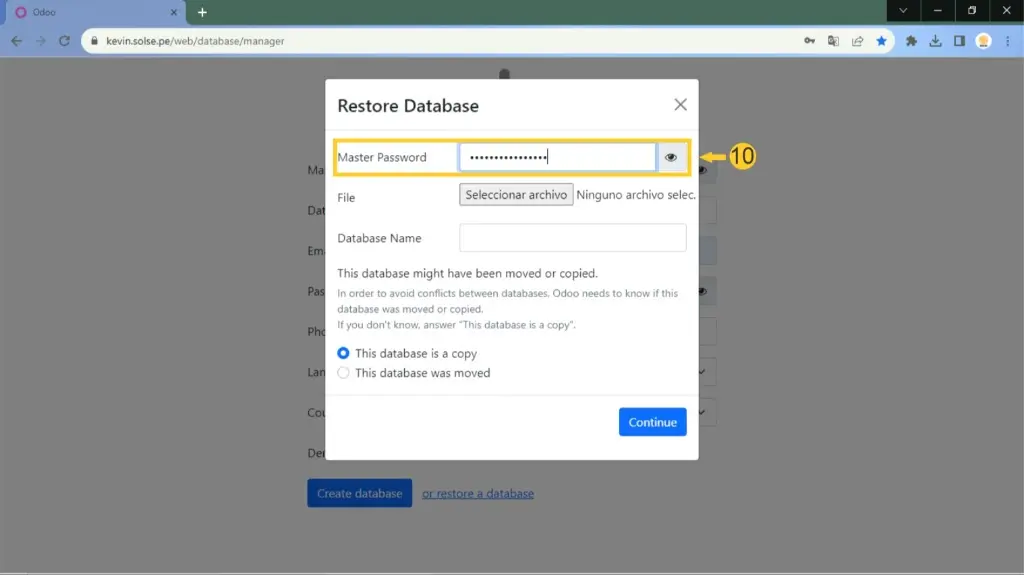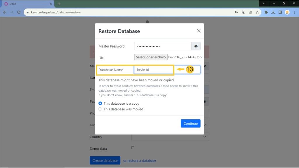14) Luego nos aseguramos que este marcado "This database is a copy" y luego clic en "Continue".