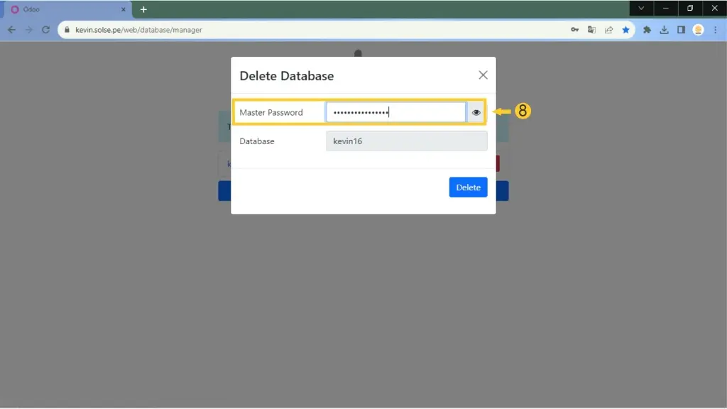 8) Colocamos la clave maestra en el campo "Master Password" y luego clic en "Delete".