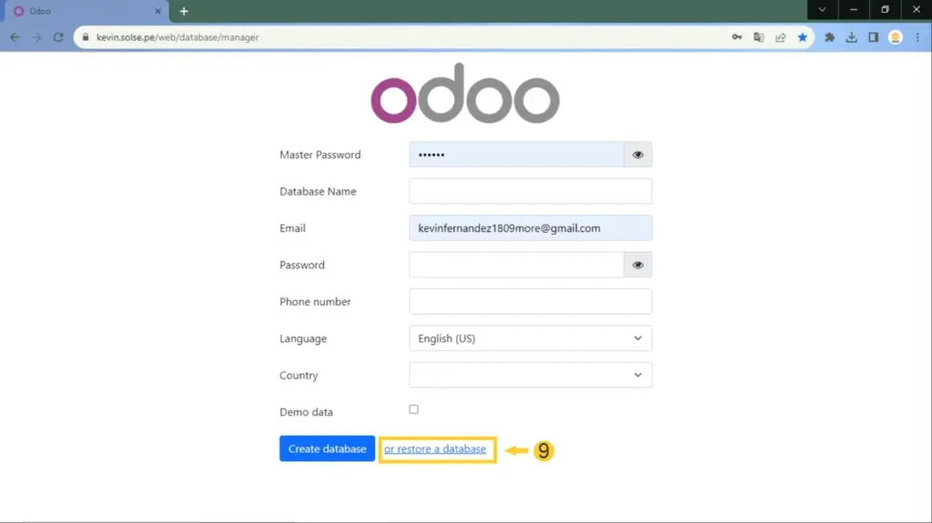 13) En el campo "Database Name" colocamos el nombre de la base, así como se muestra en el archivo del backup.