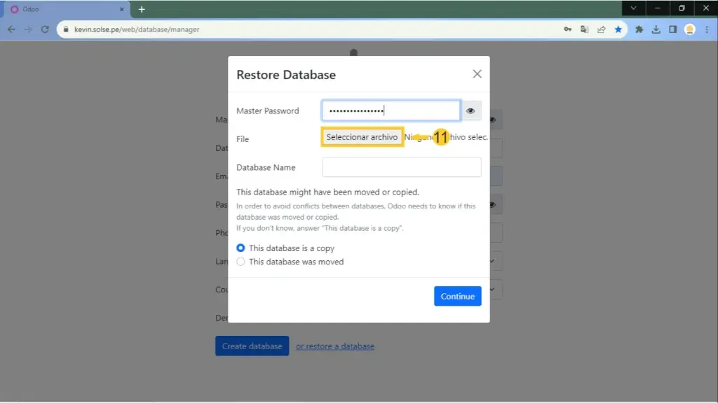11) En el campo "File" damos clic en "Seleccionar archivo" para subir el backup.