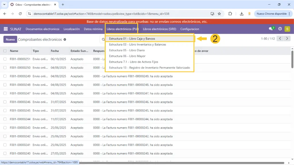 2) Luego damos clic en "Libros electrónicos (PLE), luego clic en "Estructura 01 - libro caja y banco).