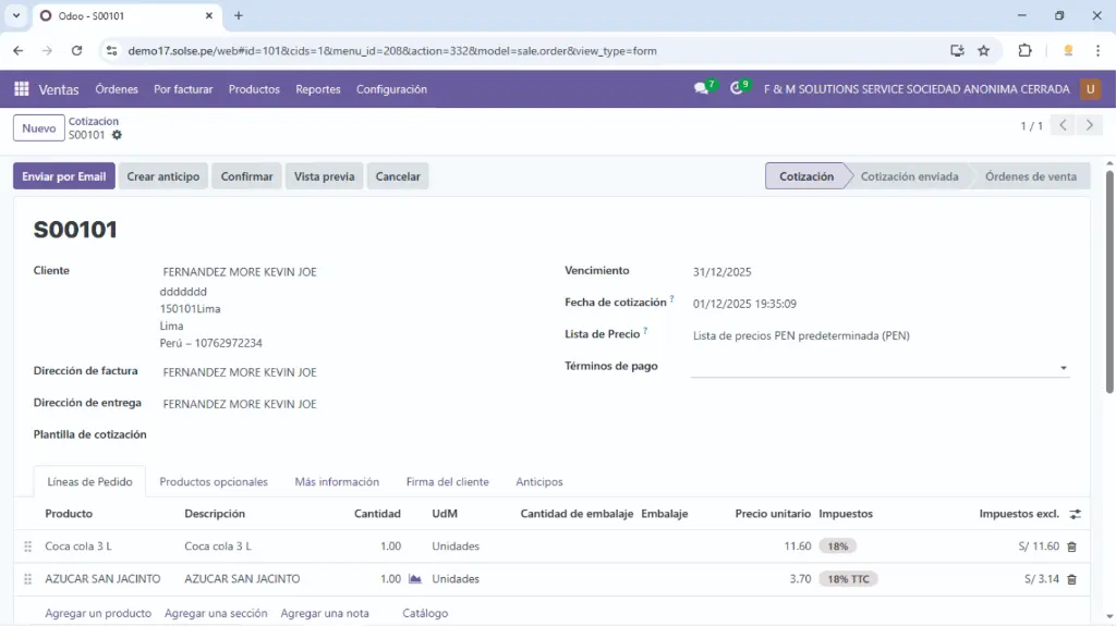 1). Nos dirigimos al módulo de venta y creamos una cotización.